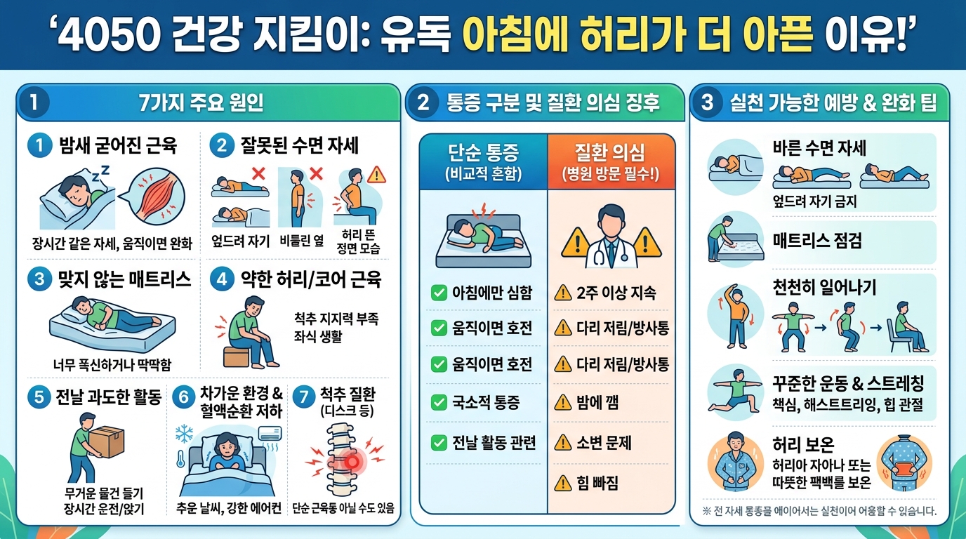 아침에 일어나면 허리가 더 아픈 이유는 대개 밤사이 근육 경직, 수면 자세, 매트리스 문제, 허리 근육 약화와 관련이 있습니다.