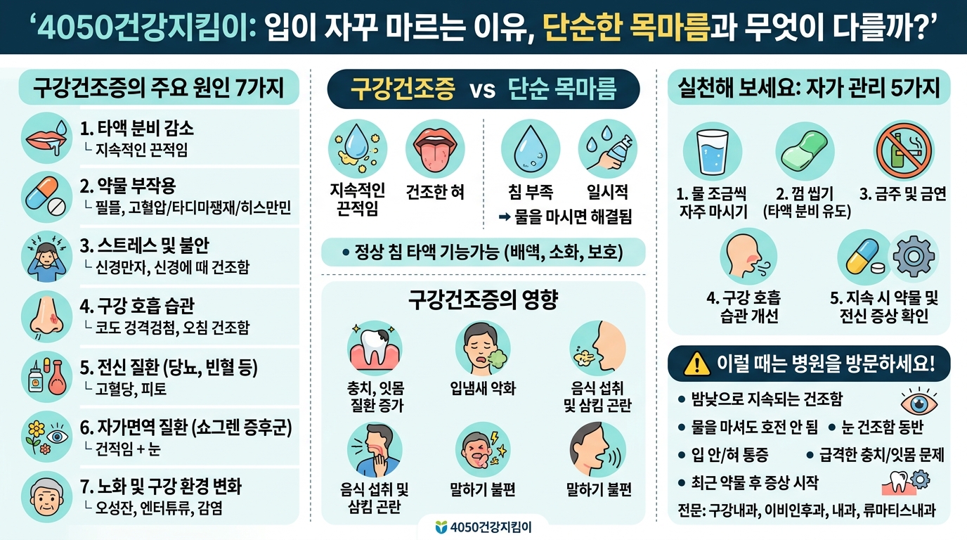 보통 갈증은 물을 조금 마시면 나아지지만, 구강건조증은 입안이 계속 끈적이고, 혀가 마르고, 침이 부족한 느낌이 반복되는 상태에 가깝습니다.