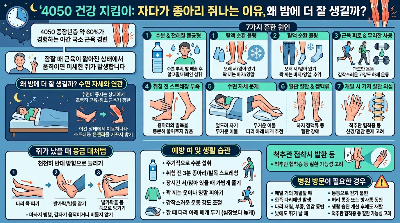 자다가 종아리에 쥐가 나는 이유는 보통 수분 부족, 혈액순환 저하, 근육 피로, 스트레칭 부족, 수면 자세 문제와 연결됩니다.