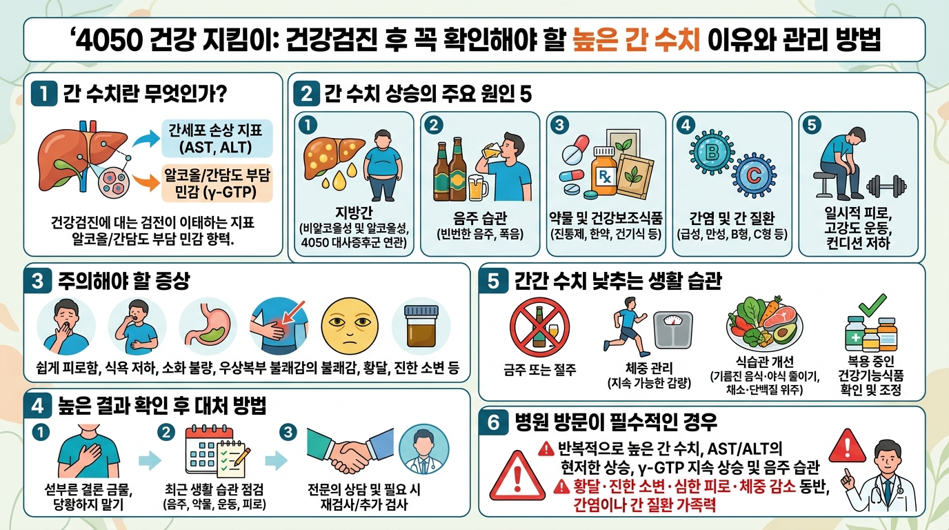 40~50대에서는 지방간, 음주, 복부비만, 대사증후군, 약물·건강기능식품 복용이 흔한 배경이 될 수 있습니다. 따라서 간수치 관리는 단순히 수치를 낮추는 문제가 아니라, 술, 체중, 식습관, 약 복용 상태를 함께 점검하는 생활관리의 문제라고 보는 것이 맞습니다.