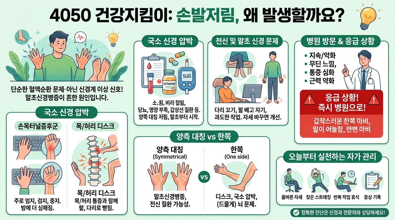 양쪽 대칭으로 저리면 말초신경 문제를, 한쪽만 저리면 국소 신경 압박이나 중추 원인을 더 의심해볼 수 있다는 점입니다.