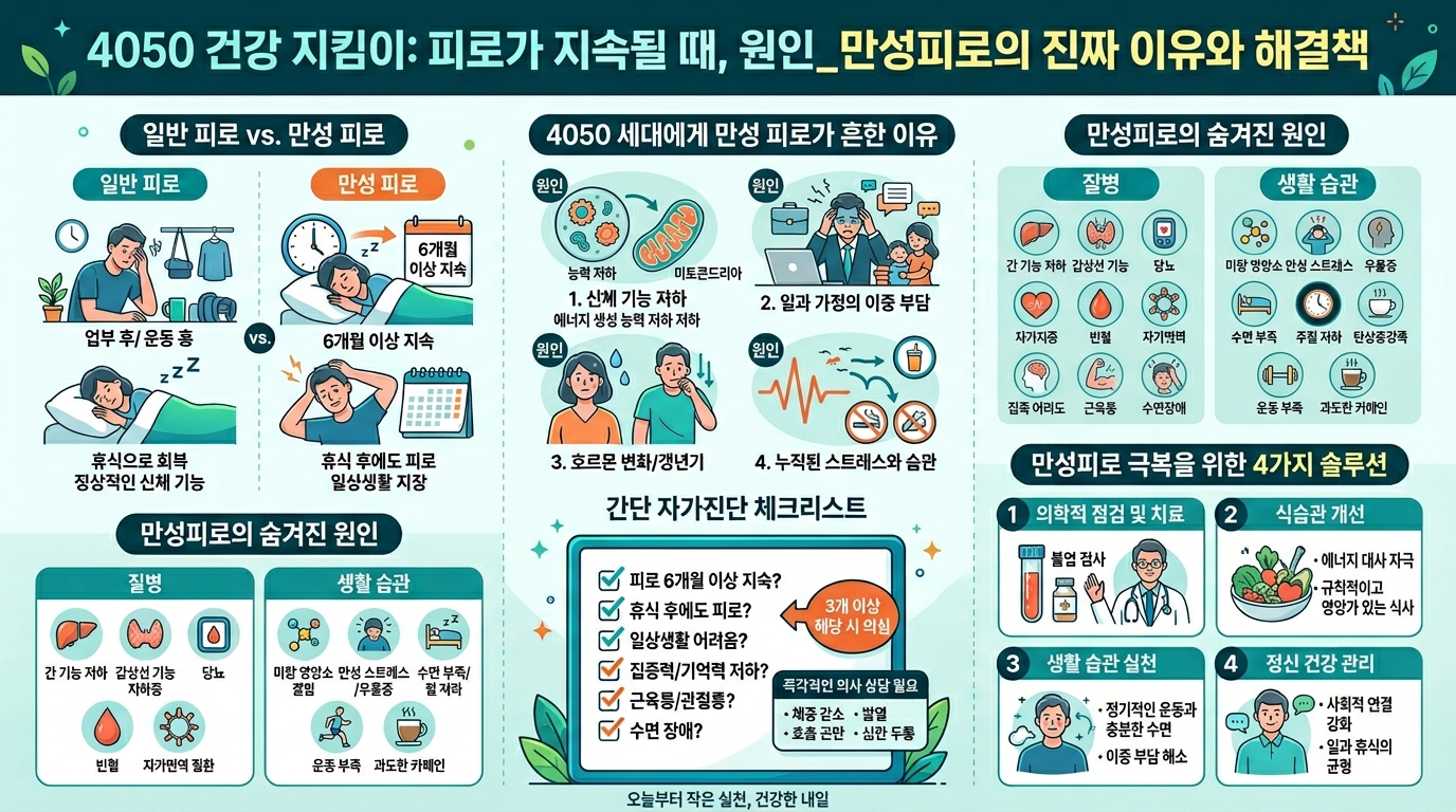 40~50대는 직장과 가정에서의 책임이 가장 큰 시기다. 많은 사람들이 피로를 느끼지만, 대부분은 "나이 탓"이라고 생각하며 넘어간다. 하지만 피로가 계속된다면, 단순한 노화가 아니라 신체가 보내는 경고 신호일 수 있다.